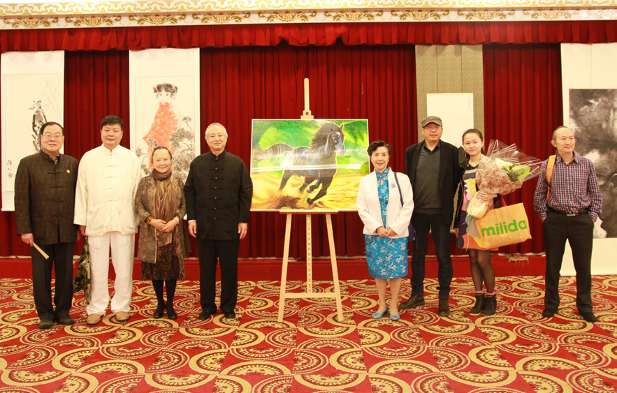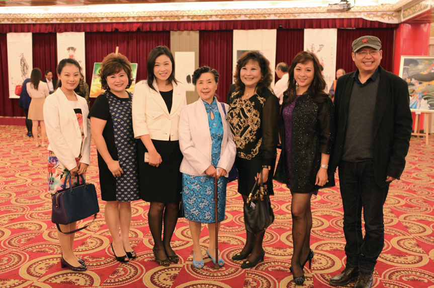 协会名誉会长赵青(右四)、丹青天地(北京)文化艺术发展有限公司副总经理吴同男(左一)、台湾亲民党妇女部部长陈姶靜(右三)、著名油画家周颖超先生(右一)等人合影留念